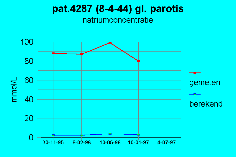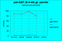 Het anticholinerge effect van medicijnen wordt afleesbaar in een vermindering van de flow rate en en de daar bij passende evenredige daling van de natriumconcentratie. Wanneer het vaatbed niet kan voldoen aan de hoge eisen van de normale secretie, lijkt er een aanpassing op te treden door activering van meer acini gelijktijdig. Het resultaat daarvan is een matige toename van de secretiesnelheid van speeksel waarin de electrolyten eiwitten in rustconcentraties voorkomen: natrium en bicarbonaat zeer laag (1-2 mmol/l., eiwitten in hogere concentraties. Zodra beschadiging optreedt van de actieve pars striata van de uitvoergang vermindert daar de natrium heropname. Dit wordt merkbaar in een scherpe stijging van natrium (fig. 4) en daling van kalium. De eiwitconcentratie neemt aanvankelijk toe, door vochtverlies naar het interstitium. Deze laatste kenmerken maken een differentiatie mogelijk tussen beschadiging en andere oorzaken van een droge mond. De oorzaken van beschadiging, bestraling, virale infectie of een allergische reactie (butazolidine, nitrofurantoine), zijn vaak aanwijsbaar. Bij exclusie daarvan is het onderzoek een goed hulpmiddel bij de diagnostiek van het syndroom van Sjögren. Bloedbeeld. Naast de andere parameters is ook de bepaling van speekselamylase (meestal totaal amylase minus pancreasamylase) in bloed van belang. Plotselinge beschadiging, zoals bij radiotherapie of de bof, leidt tot een scherpe stijging. Beschadiging met blijvend functieverlies heeft daling tot gevolg. De bepaling van speekselamylase in het bloedbeeld zou een eenvoudige maat kunnen zijn voor de progressie van de klierafbraak. Vaak echter wordt de diagnose gesteld wanneer het beeld compleet is en de secundaire complicaties het klinisch verloop bepalen.